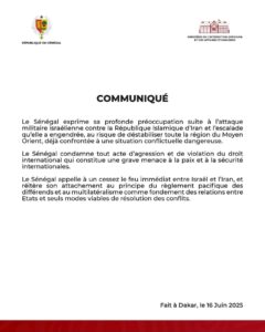 Le Sénégal exprime sa profonde préoccupation suite à l’attaque militaire israélienne contre la République Islamique d’Iran et l’escalade qu’elle a engendrée, au risque de déstabiliser toute la région du Moyen Orient, déjà confrontée à une situation conflictuelle dangereuse.