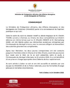 Àpres leur libération, les deux jeunes compatriotes ont été conduits jusqu’à la frontière entre le Ghana et la Côte d’Ivoire, avant de poursuivre leur route vers le Mali, où ils se sont présentés, sains et saufs, à l’Ambassade du Sénégal à Bamako, le 22 octobre 2025. Ils y ont bénéficié d’une prise en charge appropriée dans l’attente de leur rapatriement.