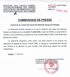 La cérémonie officielle qui marque la fin de la restitution des bases des éléments français  au Sénégal va avoir lieu ce jeudi 17 juillet 2025 à partir de 9 heures au Camp Geille de Ouakam.