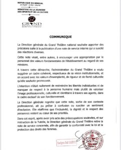 Pour rappel dans une note de service datée du 14 juillet 2025, la Direction générale du Grand Théâtre de Dakar interdit à l’ensemble du personnel le port de greffages, de perruques et les pratiques de pigmentation au sein de l’administration.