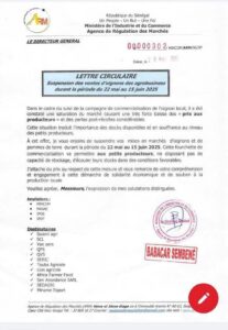 L’Agence de Régulation des Marchés(ARM) du Ministère de l’Industrie et de Commerce sur une lettre circulaire annonce la suspension provisoire des vente d’oignons par les Agribusiness du 22 mai au 15 juin.
