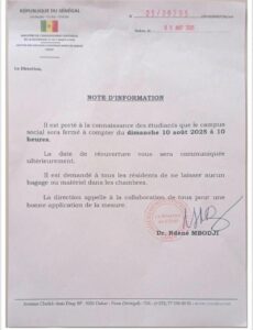 Le Centre des Œuvres universitaires de Dakar (COUD) informe les étudiants de l’université Cheikh Anta Diop (UCAD) que le campus social sera fermé à compter du dimanche 10 août 2025 à 10h.