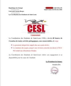 Le coordination des étudiants de Saint Louis ( CESL) a décrété 48 heures de cessation de toutes activités pédagogiques non renouvelables.