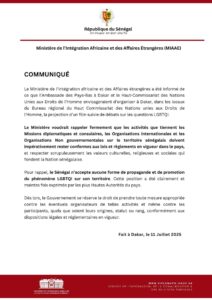 Pour rappel, le Sénégal n’accepte aucune forme de propagande et de promotion du phénomène LGBTQI sur son territoire. Cette position a été clairement et maintes fois exprimée par les plus Hautes Autorités du pays.