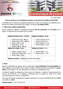 Dans un communiqué du 15 octobre 2025, le ministère de la santé a fait le Point de situation sur les épidémies de Mpox et de Fièvre de la Vallée du Rift (FVR).